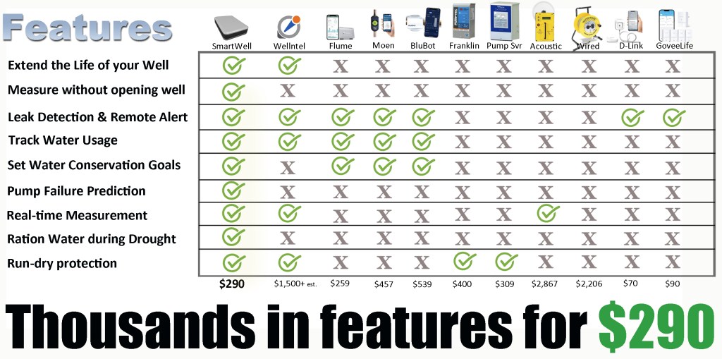 SmartWell can track water usage, identify water leaks, forecast pump failure, and increase the life of a well through proper water level management. It can eliminate the risk of running a well dry, provide active water table measurement, intelligently ration your water, set conservation goals, and remotely alert you of issues before they become issues. These features are all possible through the Al-powered SmartWell device.